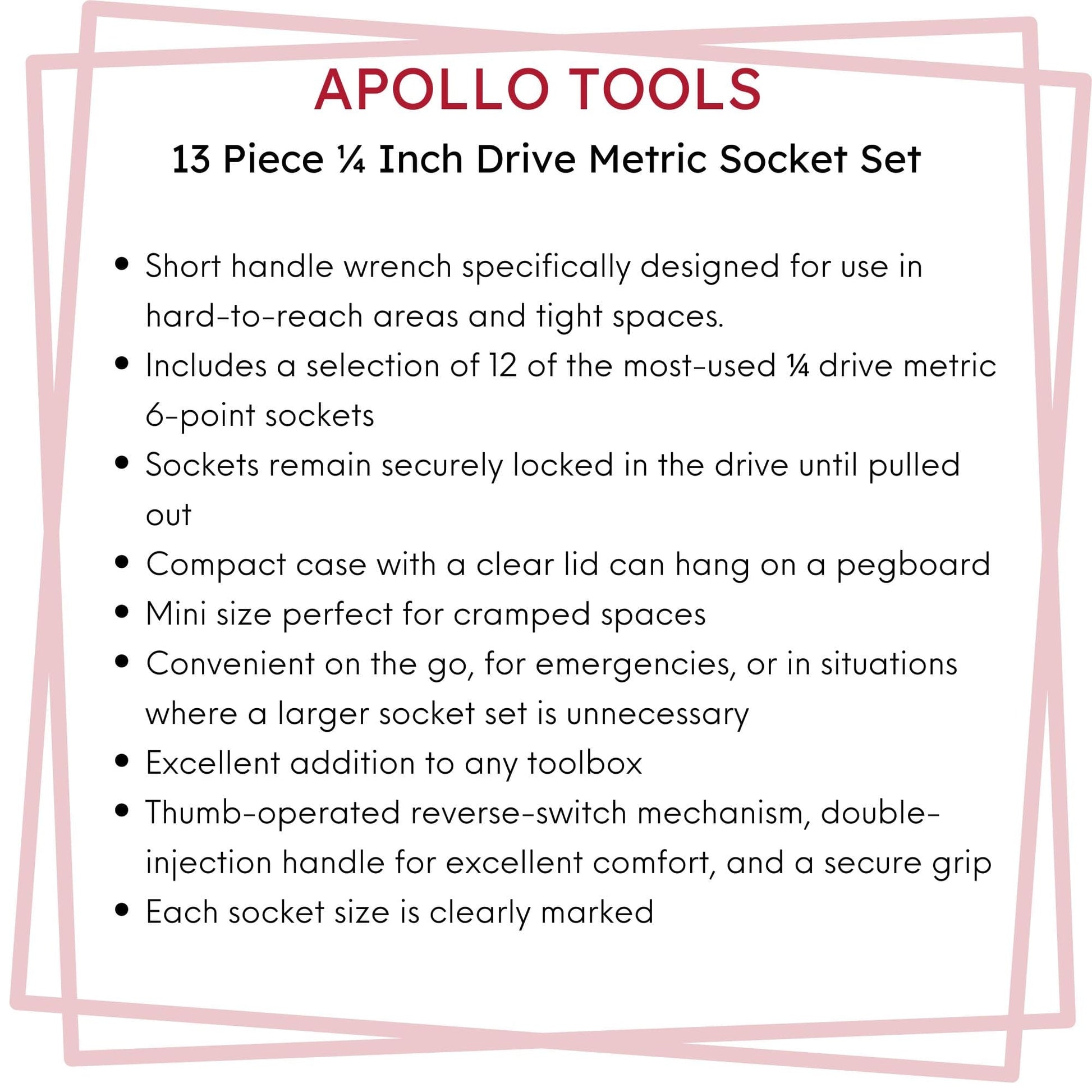 Apollo Tools’ ¼" mini ratchet set is an excellent addition to any toolbox. The short handle of the ratcheting wrench is specifically designed for use in hard-to-reach areas and tight spaces where a standard-sized wrench cannot fit. It comes in a compact case with a clear lid that can be easily hung on a pegboard and includes a selection of twelve of the most commonly used ¼” sockets.