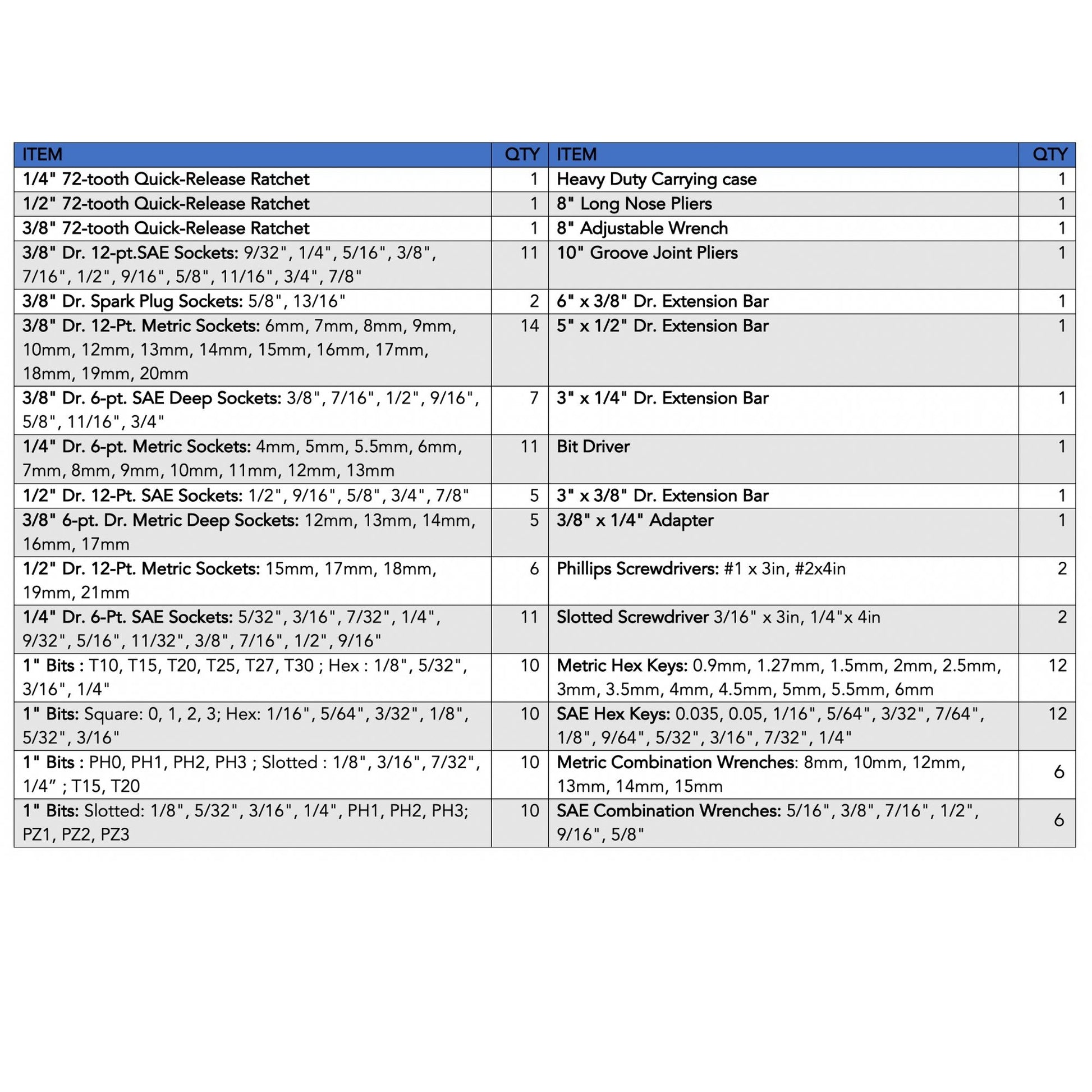 SOCKETS, WRENCHES & MORE: Contains the most needed mechanics tools and the most popular sizes of SAE and metric sockets including spark plug sockets and deep sockets, several sizes extension bars, 40 screwdriver bits, and SAE and metric hex keys. 3 sizes 72-tooth ratchet handles, groove joint pliers, long nose pliers, and adjustable pliers will meet most needs during repairs and maintenance.