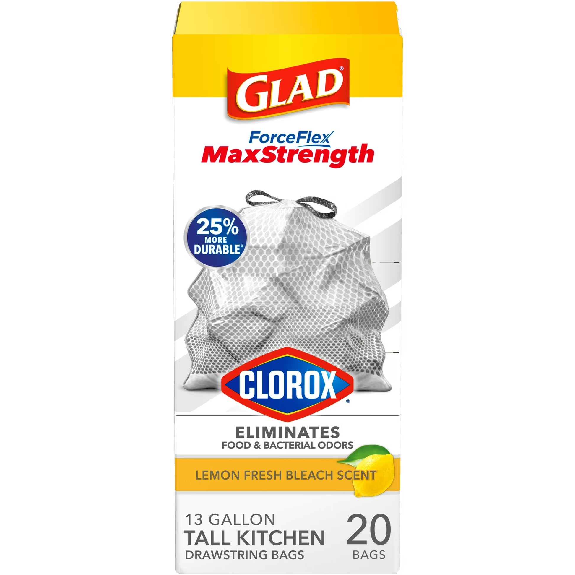 - HELP ELIMINATE FOOD AND BACTERIAL ODORS: Glad ForceFlex MaxStrength with Clorox™ Tall Kitchen Trash Bags help you take control of the toughest food and bacterial odors in your kitchen