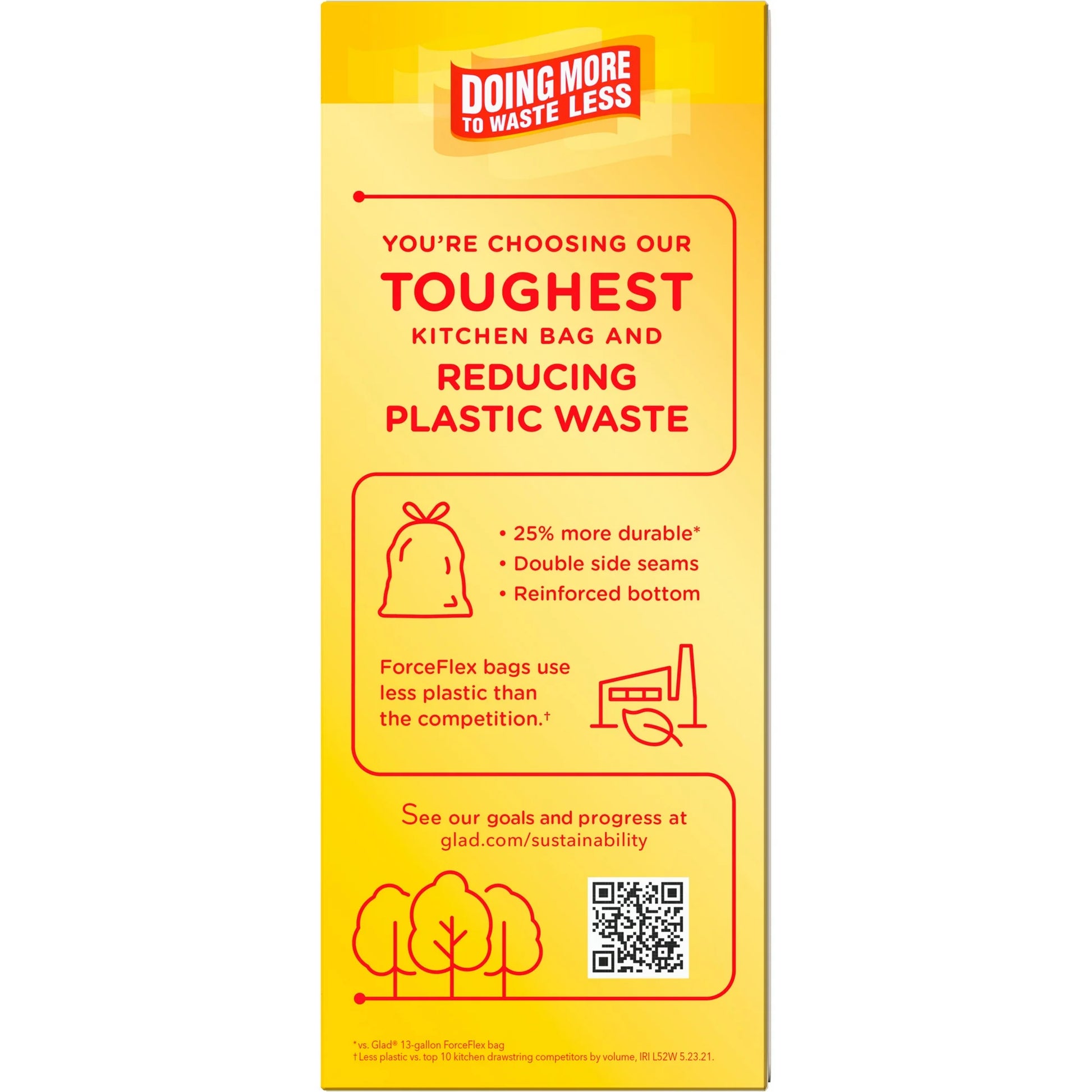 - 25% MORE DURABLE*: Glad® ForceFlex MaxStrength Tall Kitchen Trash Bags are 25% more durable versus Glad® 13 gallon ForceFlex tall kitchen bags; packaging may vary
