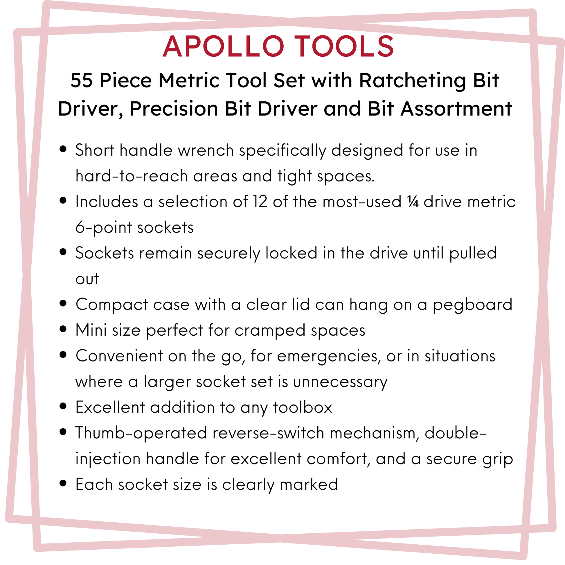 BACKED BY APOLLO TOOLS’ LIFETIME WARRANTY. Built from carbon steel and heat-treated, this socket set meets or exceeds ANSI specifications, and is backed by Apollo Tools’ lifetime warranty on manufacturing defects. If any part is defective in material or workmanship, we will replace it free of charge with the same item or a like item of equal value. Click on this link to register your Apollo Tools product.