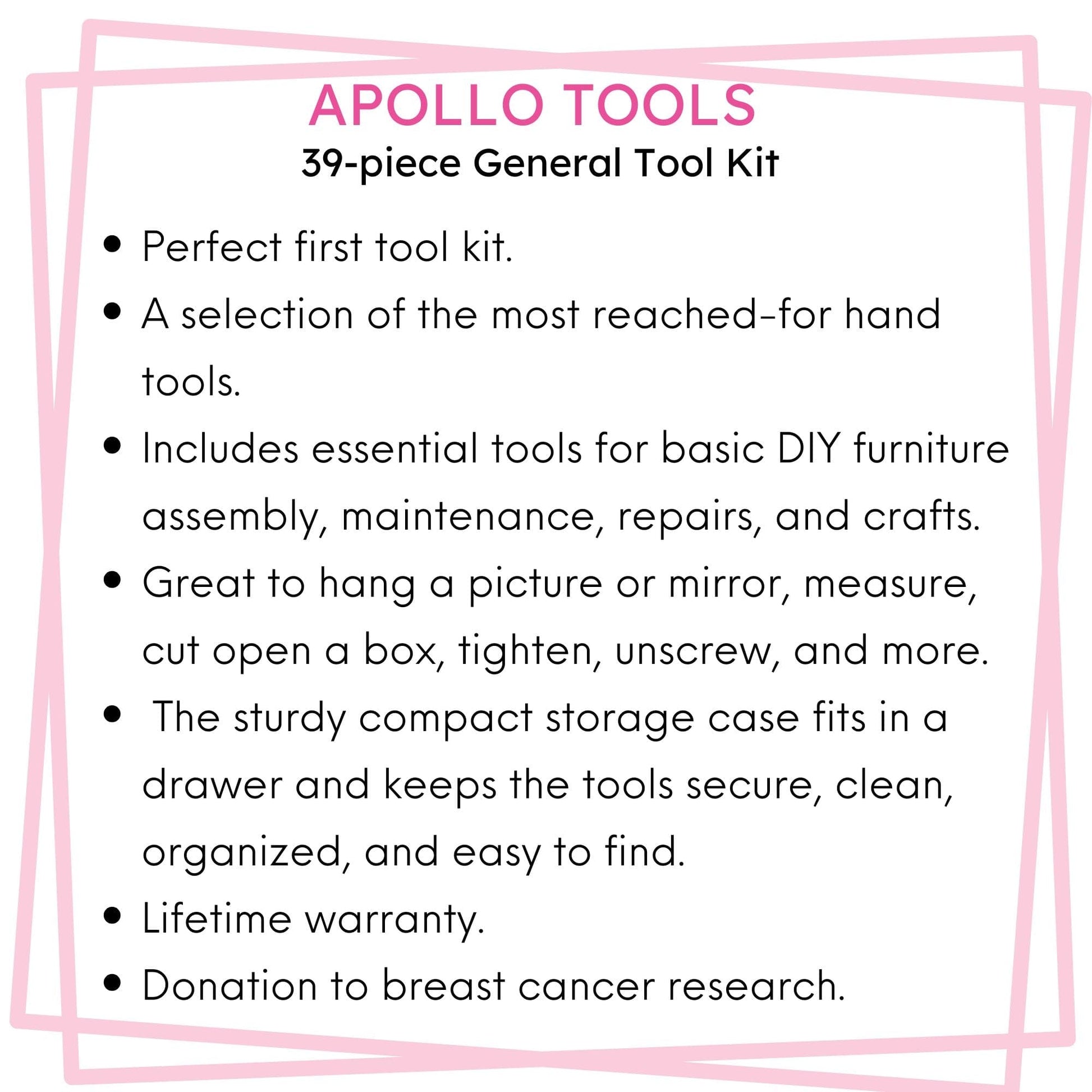 DONATION TO BREAST CANCER RESEARCH.  Apollo Tools, Ltd is donating $0.50 from this purchase to the Breast Cancer Research FoundationÂź. BCRFâs mission is to advance the worldâs most promising research to eradicate breast cancer. For more information about BCRF, visit bcrf.org. You can read more about Apollo Tools' breast cancer commitment here.