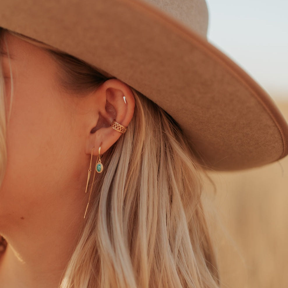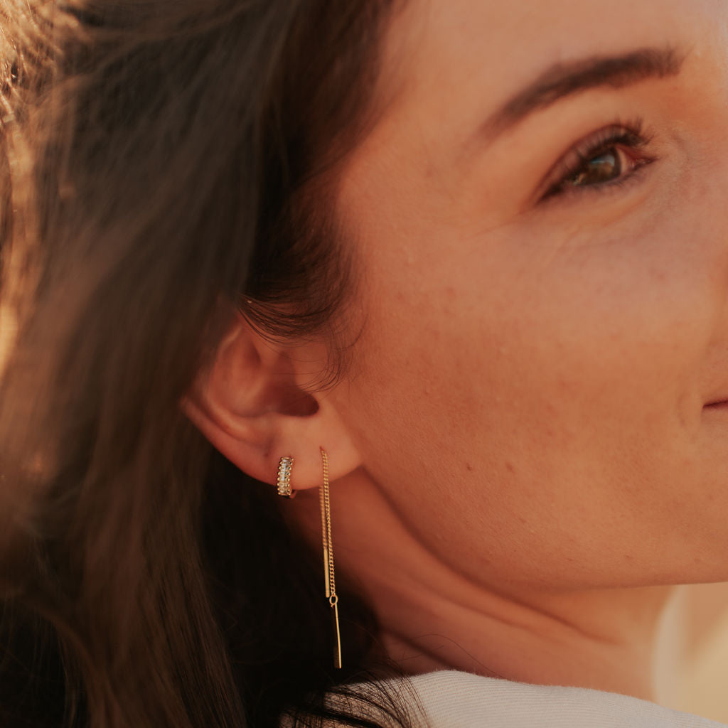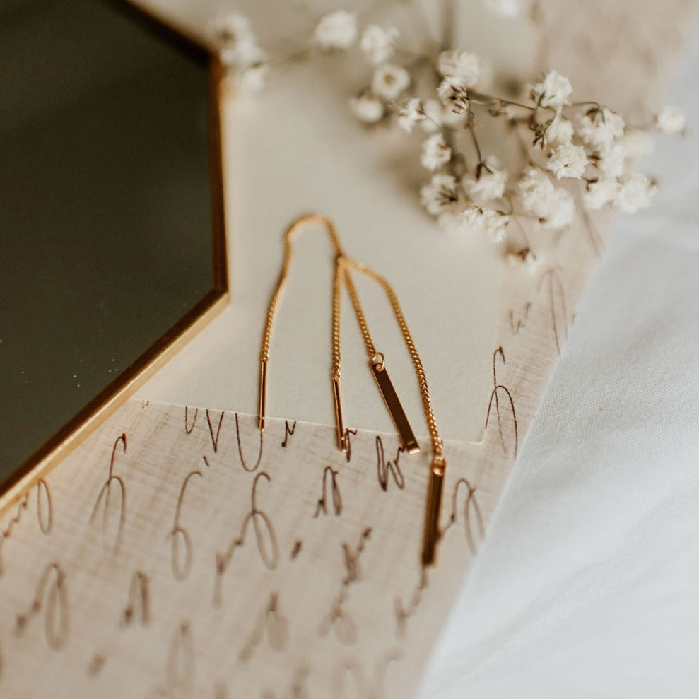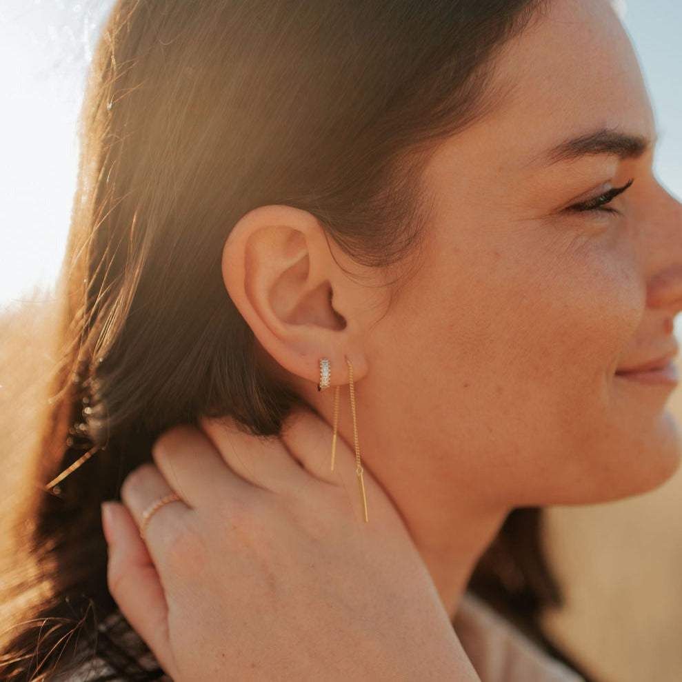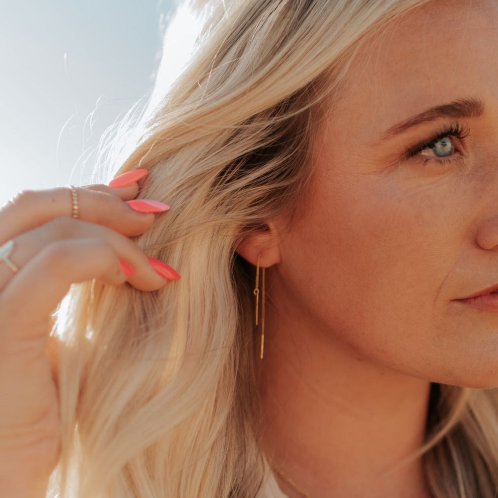The Aria Classic Threaders are this season's must have jewelry. Made of hypoallergenic gold vermeil (gold plated sterling silver), these earrings are wear and tarnish resistant and perfect with any outfit.