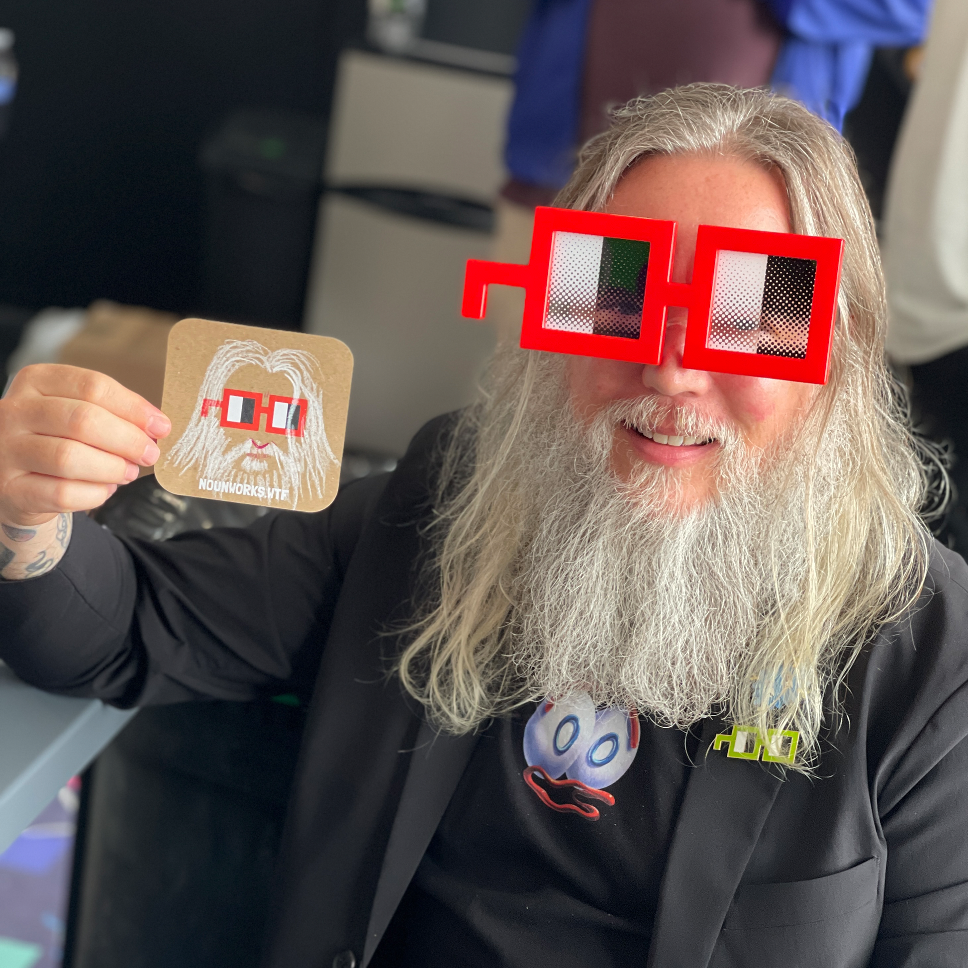 Designed and manufactured by the visionaries at Bigshot Toyworks, these super high quality IRL Noggles are a hit everywhere we take them! This classic red color is the most well-known color of the world famous Nouns Glasses. Each pair of Noggles comes in a beautiful gift box and is packed with a mini Nouns keychain charm and a POAP.