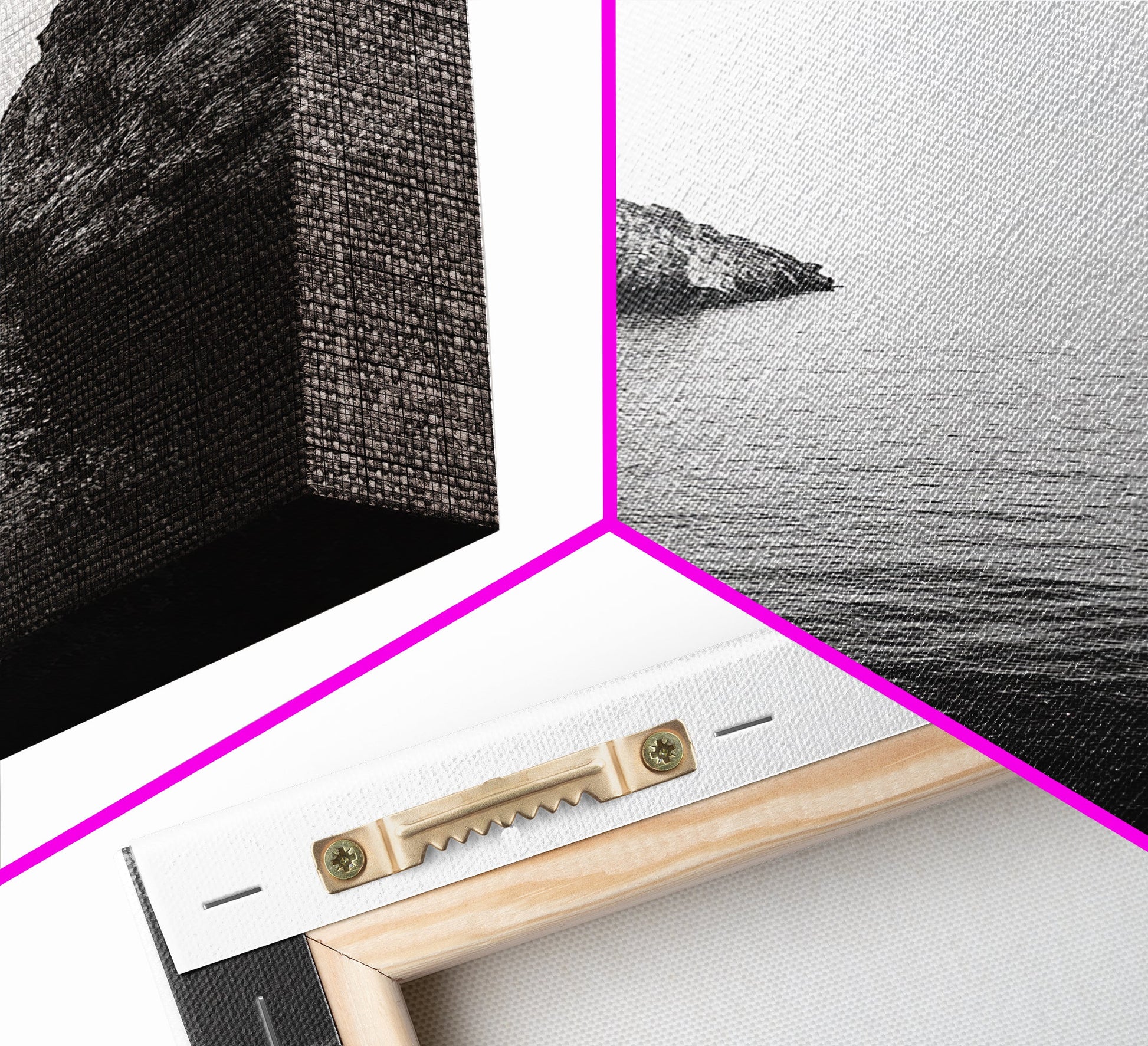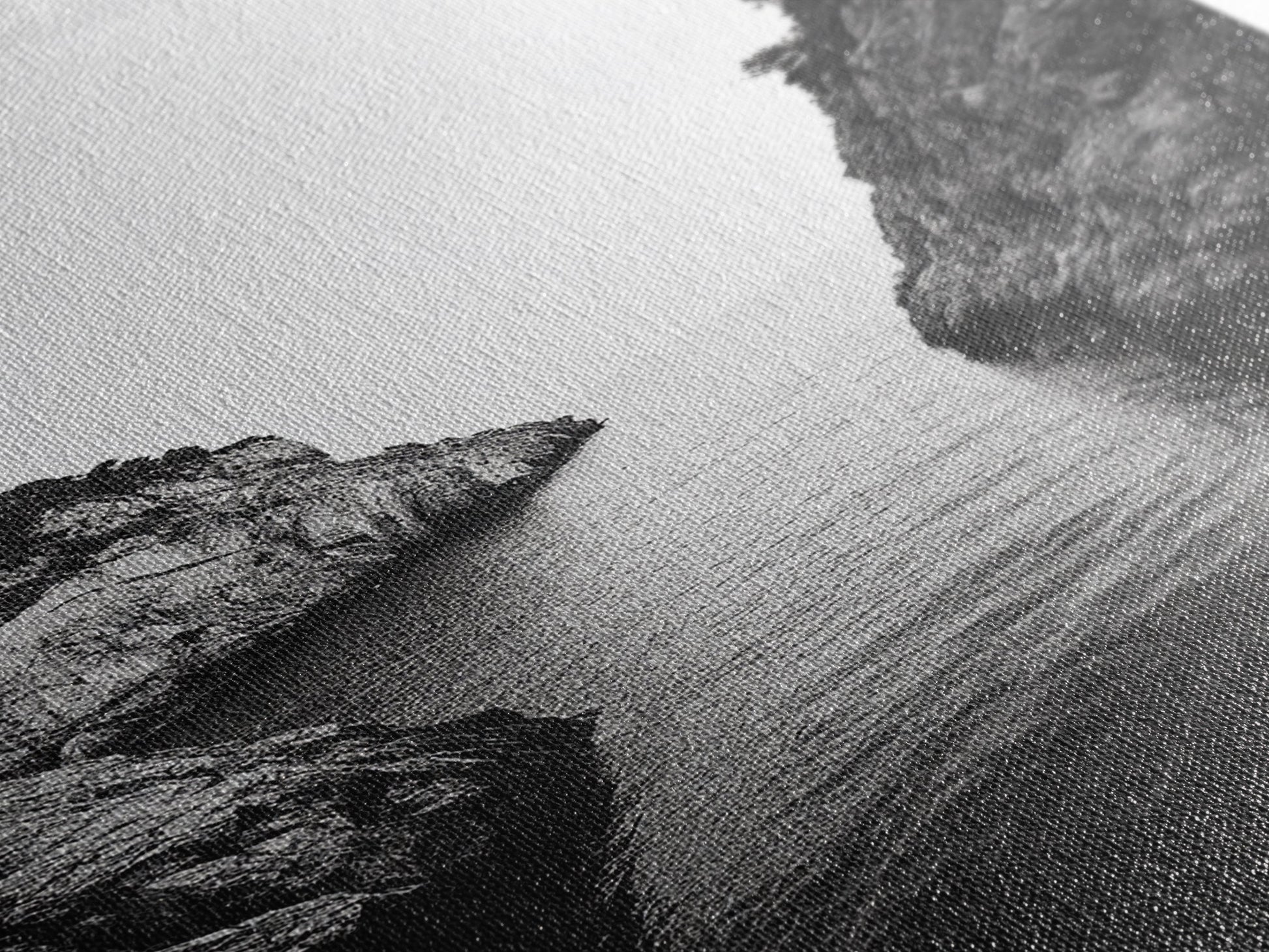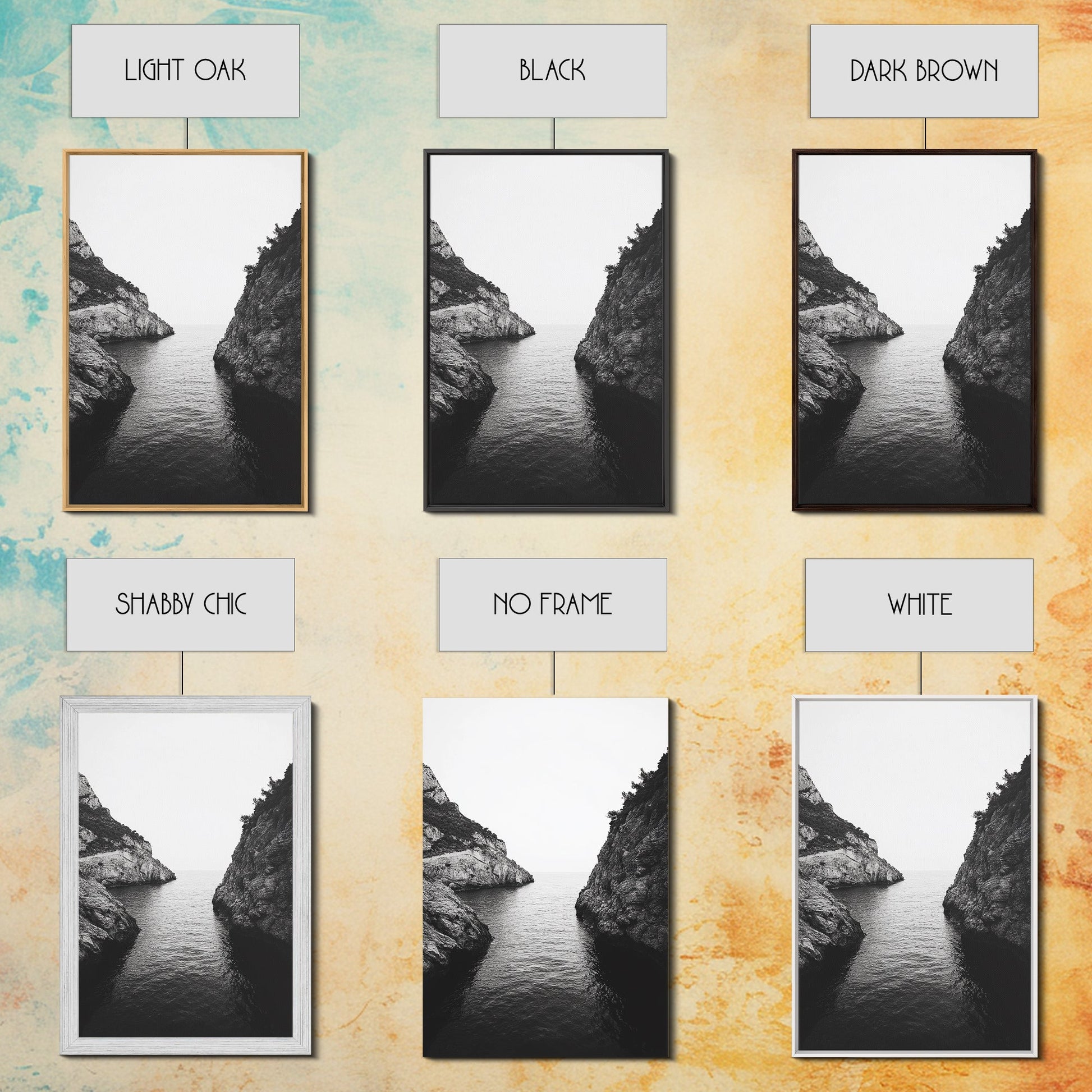 Cliffs, Ocean, Channel, Serenity - Dramatic rocky inlet view, Framed Canvas Print, ideal bathroom or hallway wall art, nature lover minimalist