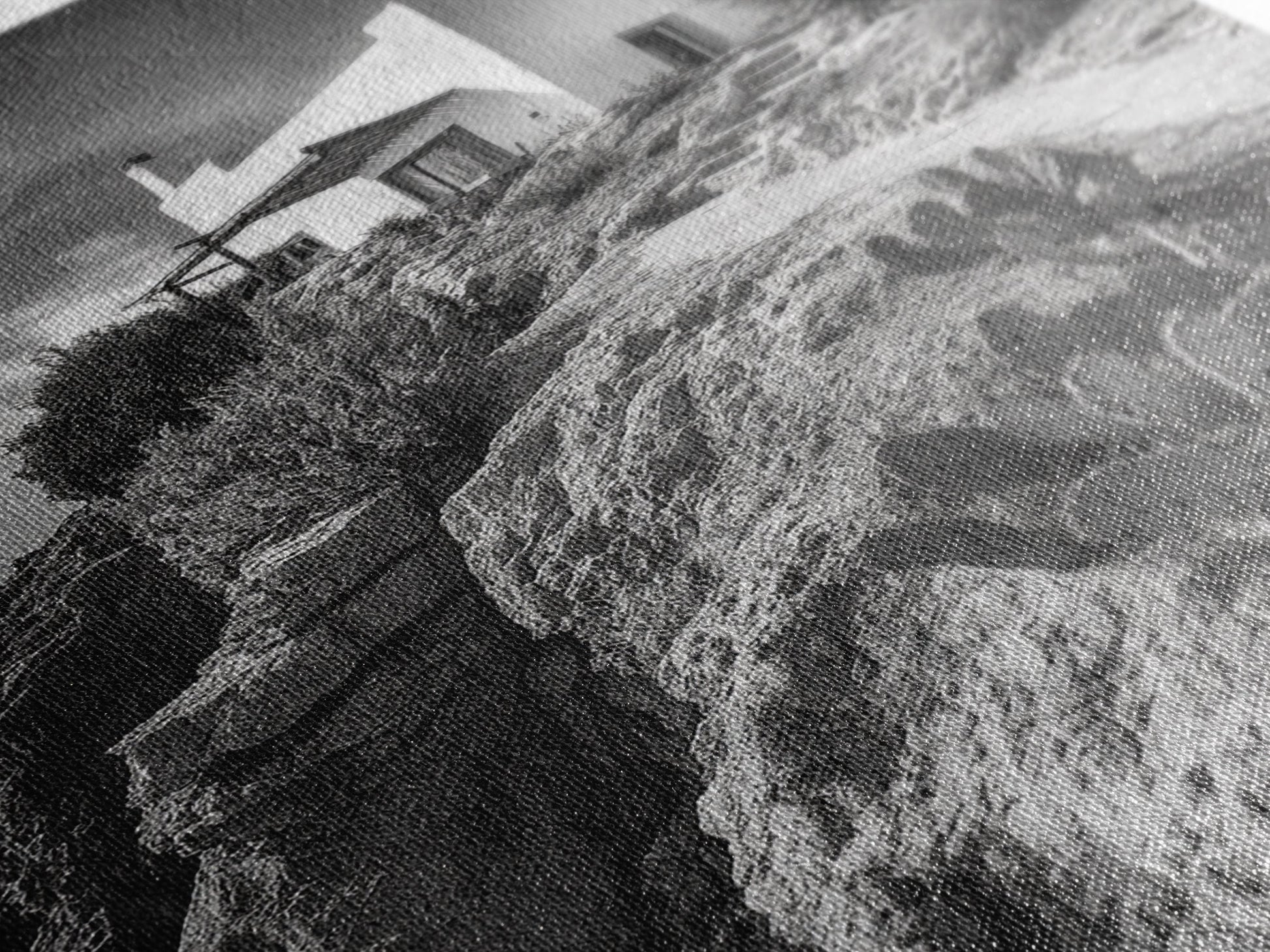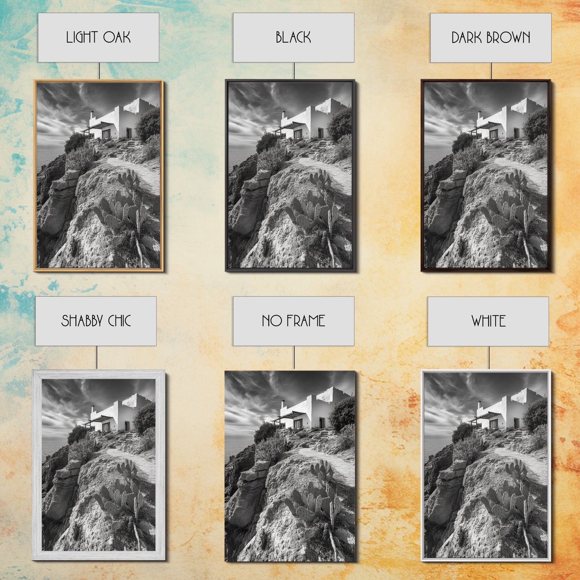 Cliffside Villa, Mediterranean Home, Desert Garden, Rustic Landscape Print, Framed Canvas Print, Modern Boho Living Room Art