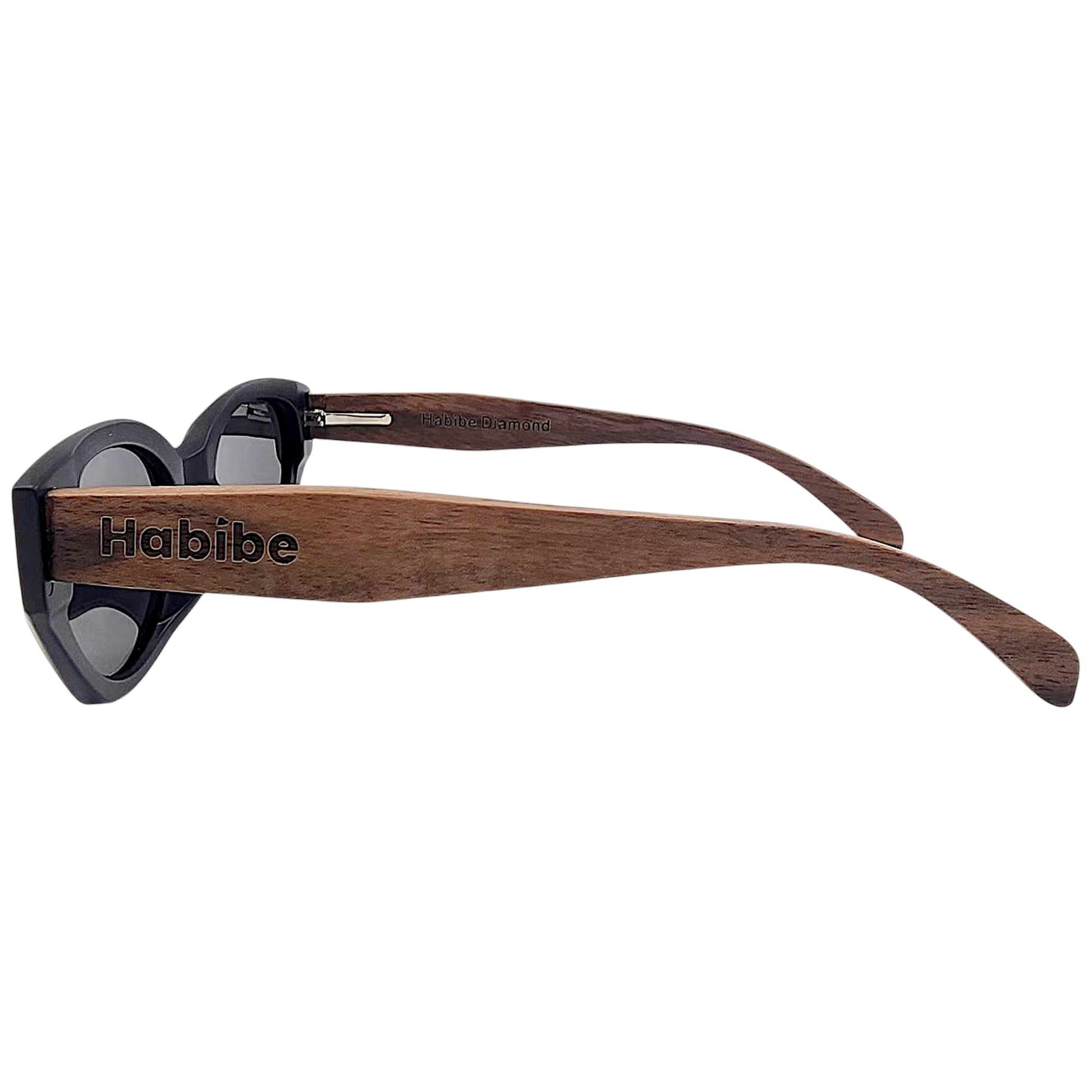 Detailed diamond shape frame with double rivet details on sides of frame. Handcrafted spring hinge walnut wood temples with Habibe signature logo.
