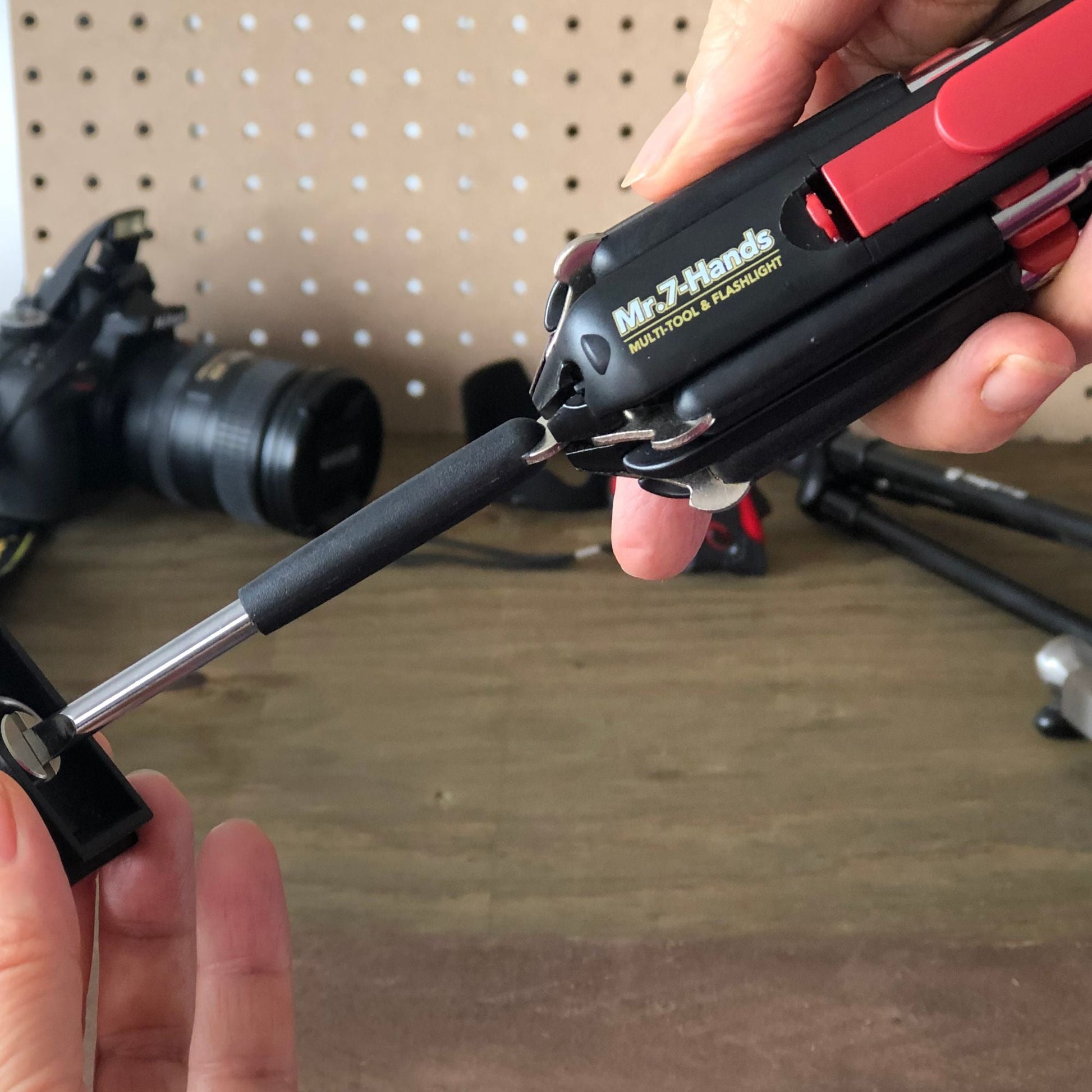 A POWERFUL LED FLASHLIGHT. Mr. 7-Hands features two lights: a powerful LED flashlight and a work light for use in dark spaces. 2 AAA batteries are required for the lights, but not included.