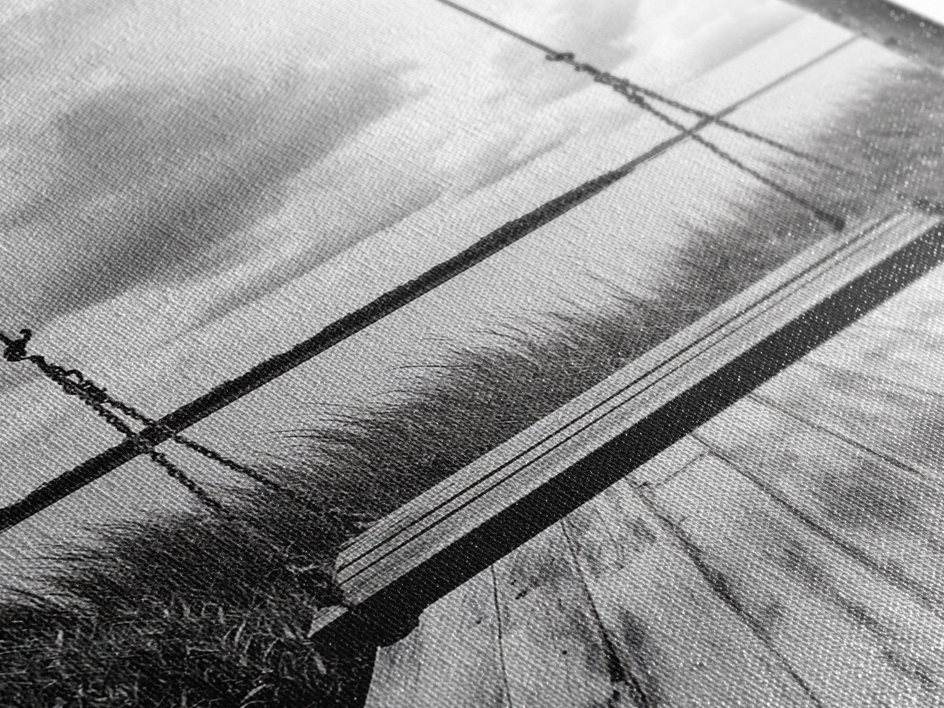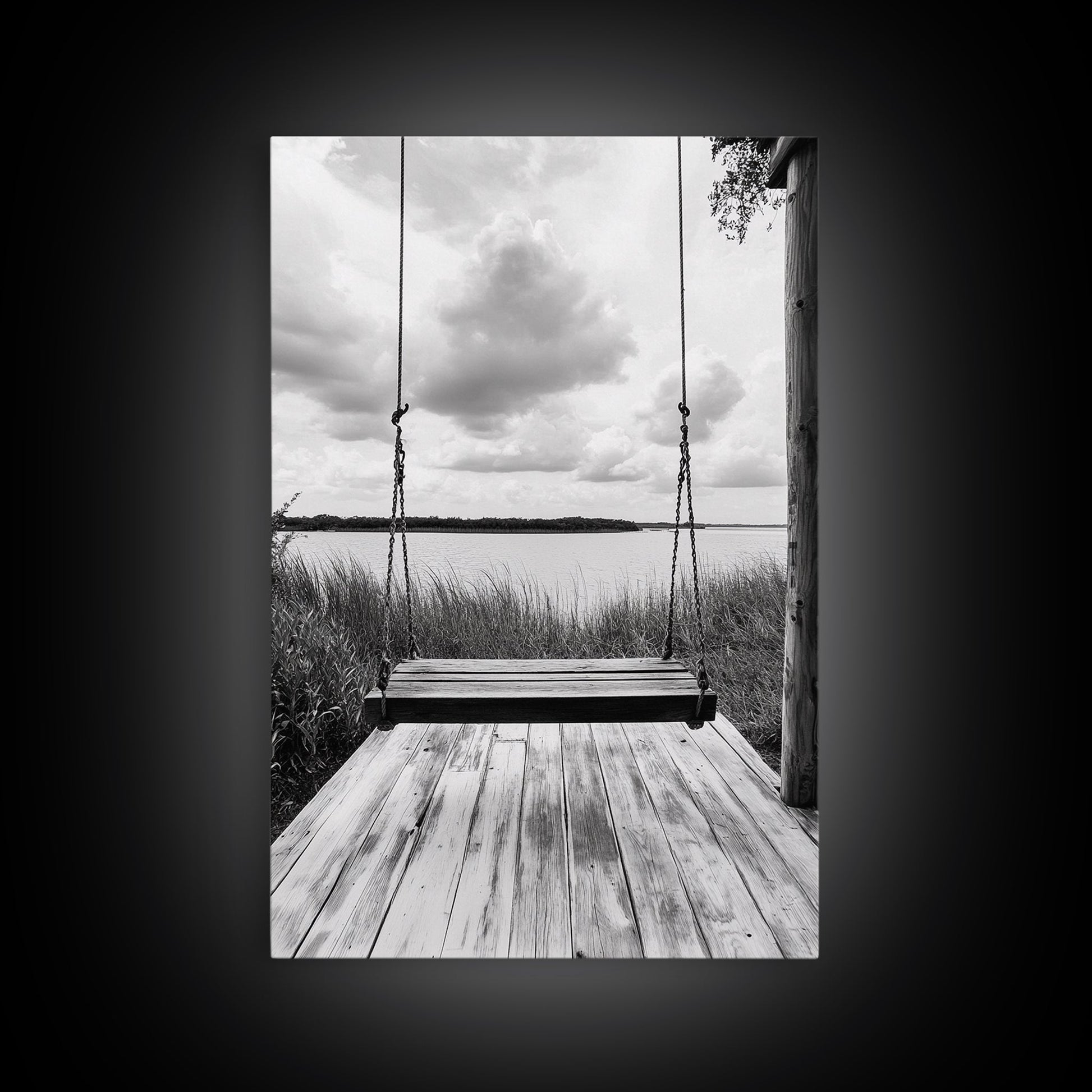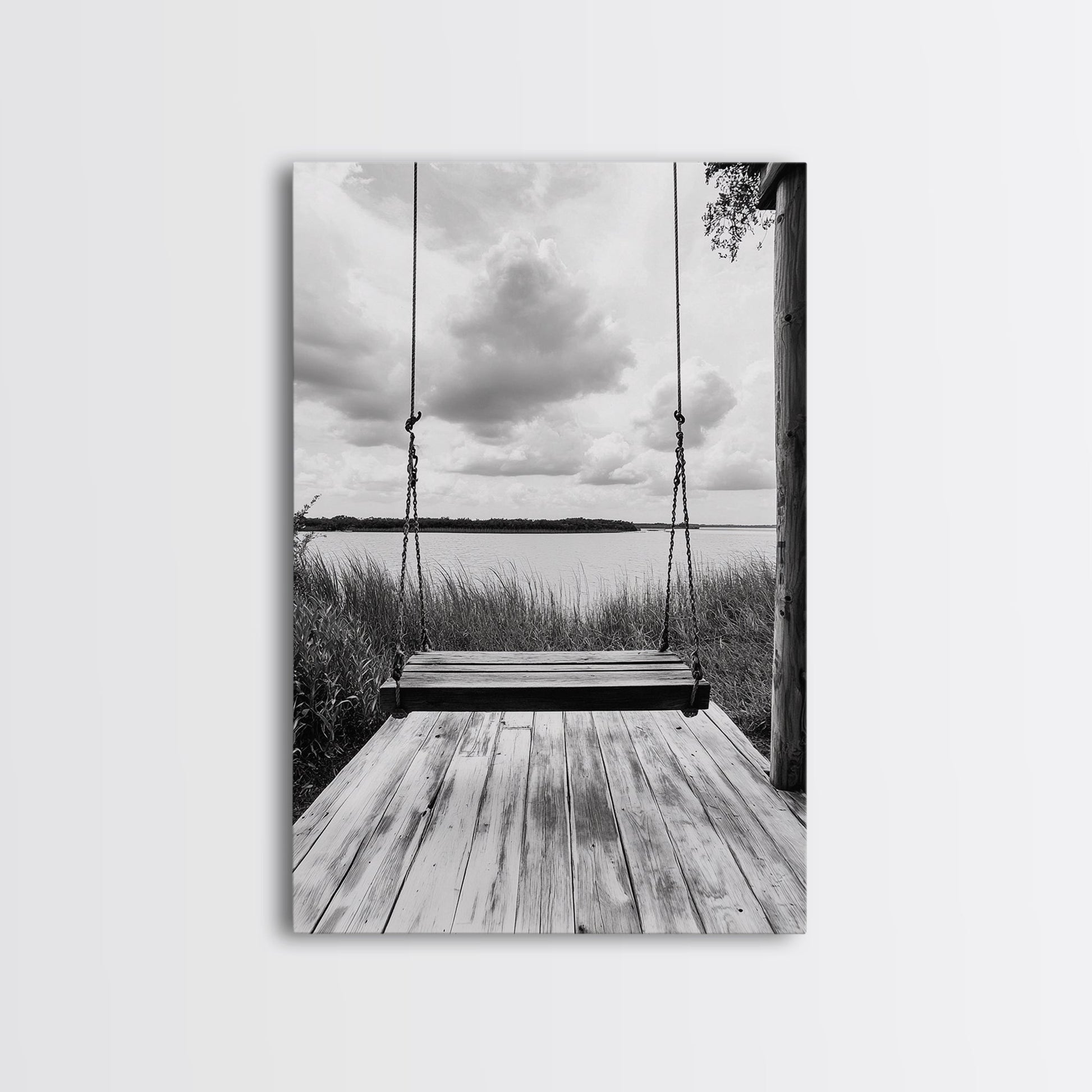 Lake Swing, Cloudy Sky, Calm View, Framed Canvas Print, Farmhouse Wall Art, Serene Kitchen Decor, Rustic Black and White Photography