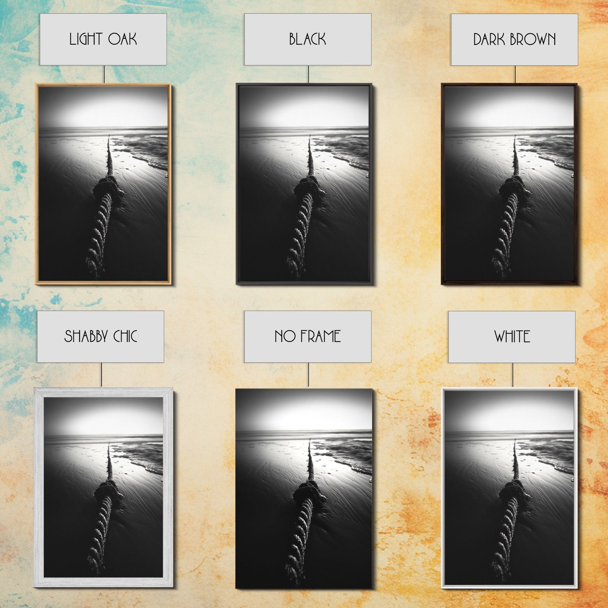 Ocean Rope Shore, Nautical Minimalism, Seaside Monochrome, Black and White Calm, Framed Canvas Print, Bedroom Wall Art, Coastal Decor