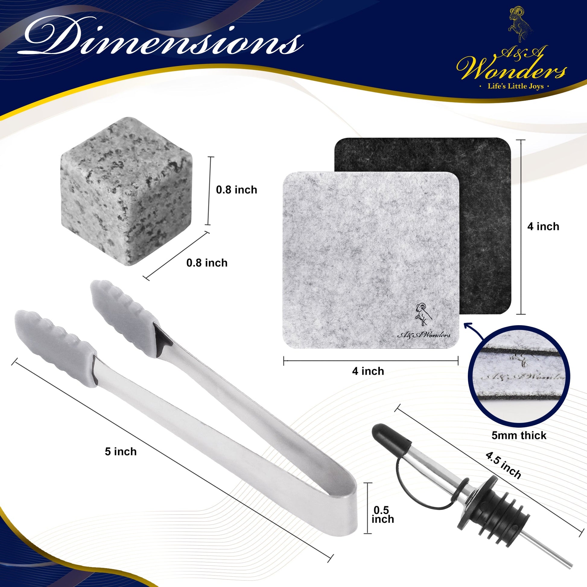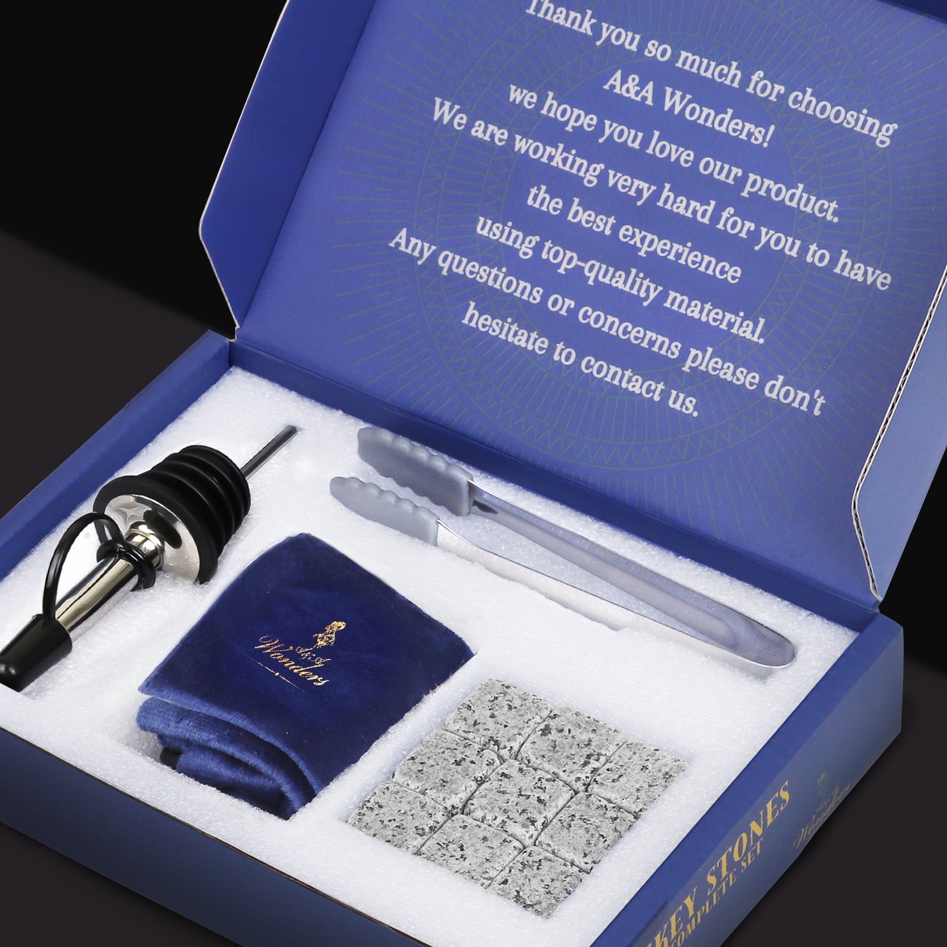- COMPLETE SET - NEW AND IMPROVED 2023 SET WITH A NICER GIFT BOX AND BETTER QUALITY. in addition, we added a liquor pourer to enhance your experience. the set Includes 9 cubes whiskey stones, 5 inch Ice tong, and 2 coasters to increase your drinking experience to the max! Cheers!