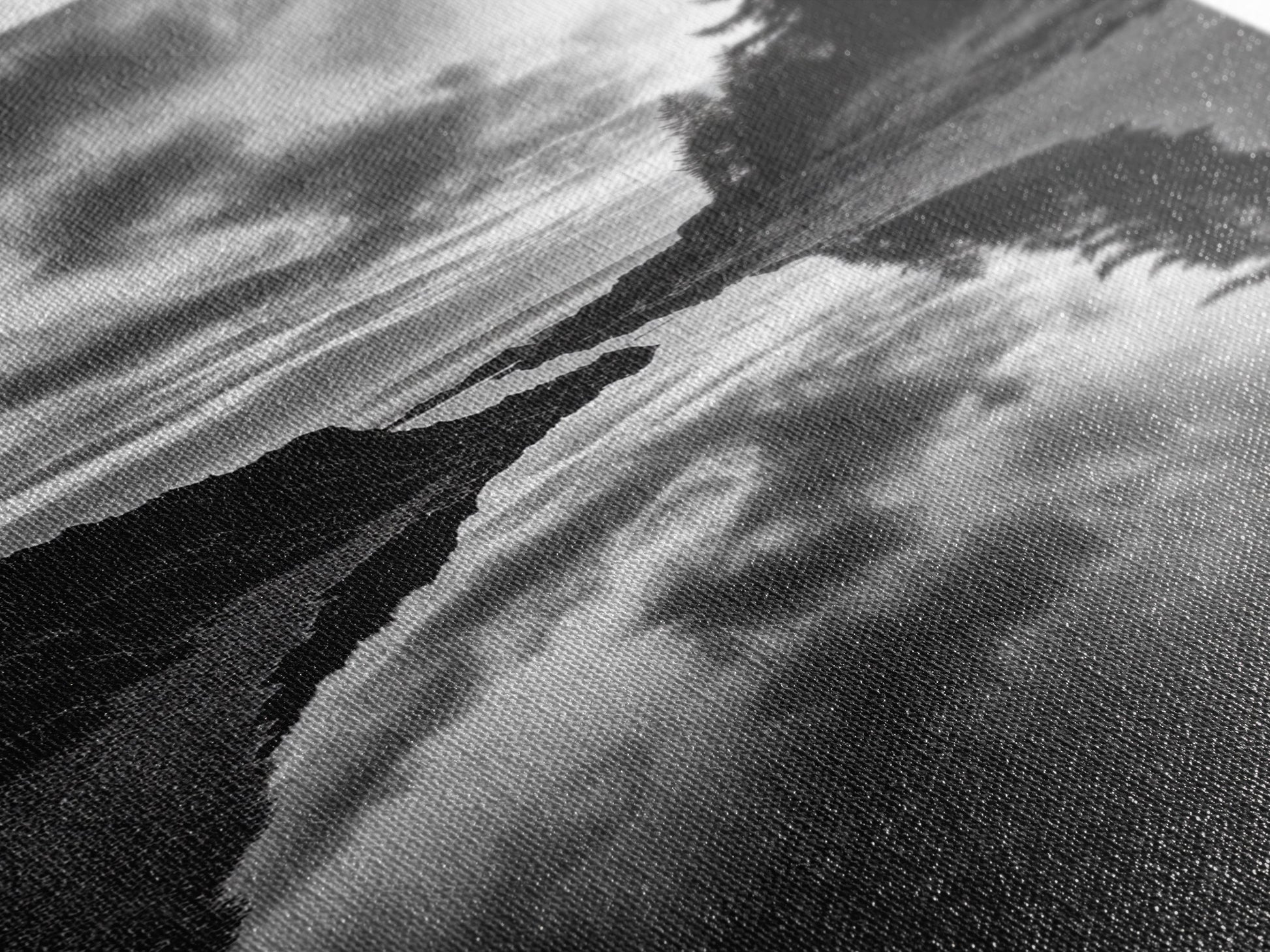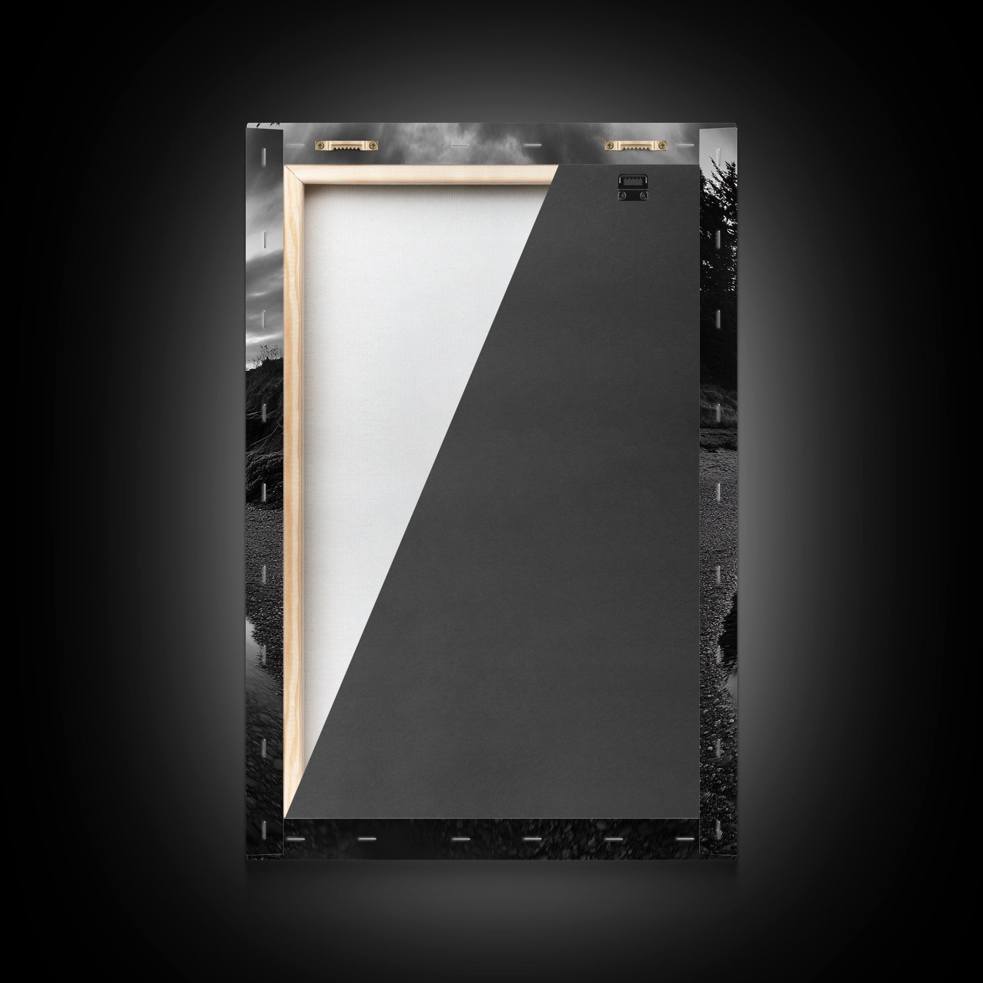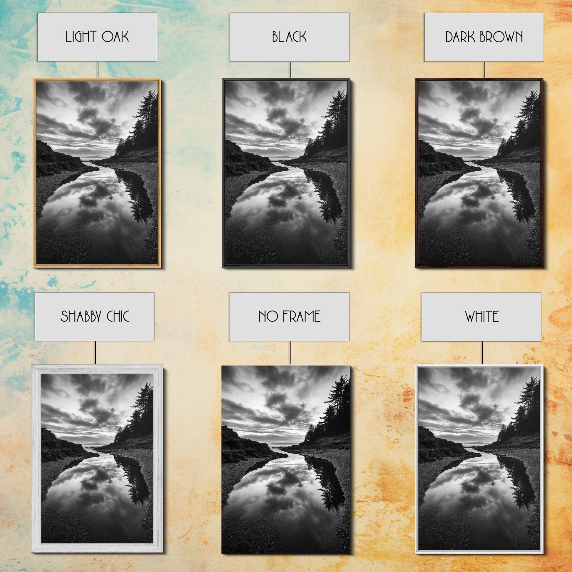 Reflective Tide Pool, Dramatic Sky, Forest Silhouette, Black and White Seascape, Framed Canvas Print, Living Room Wall Art, Nature Boho Style