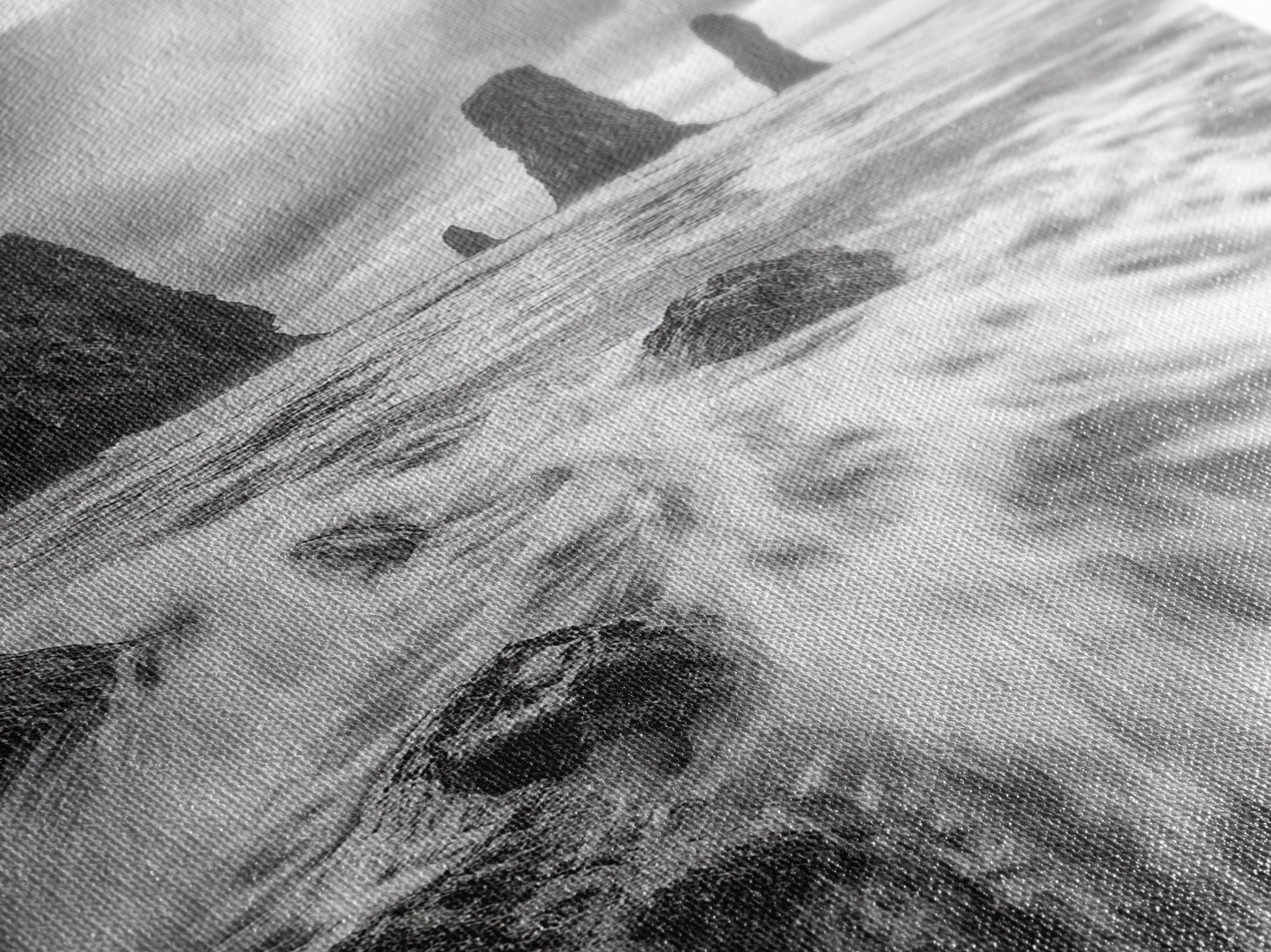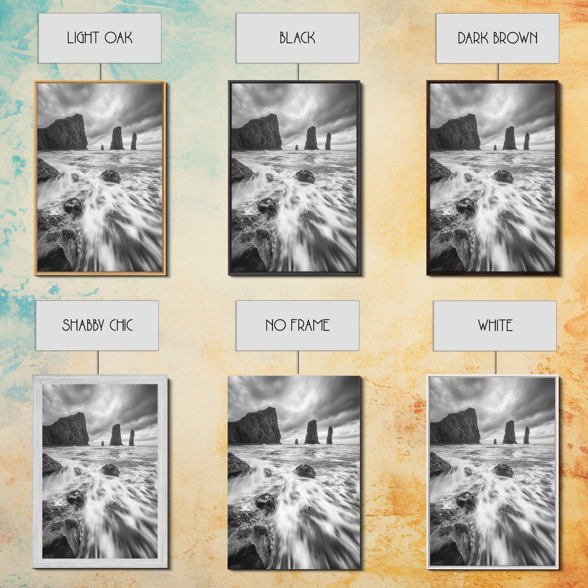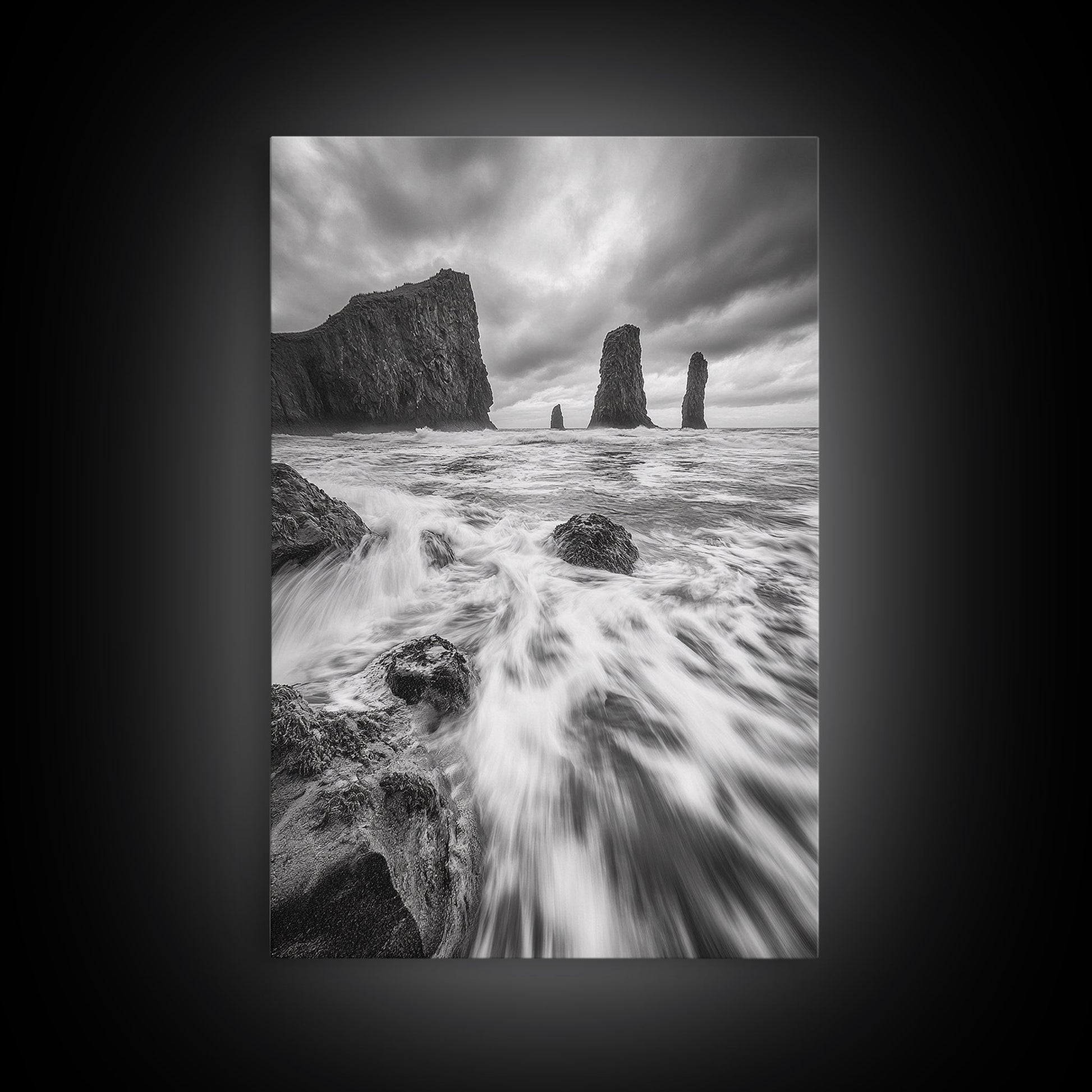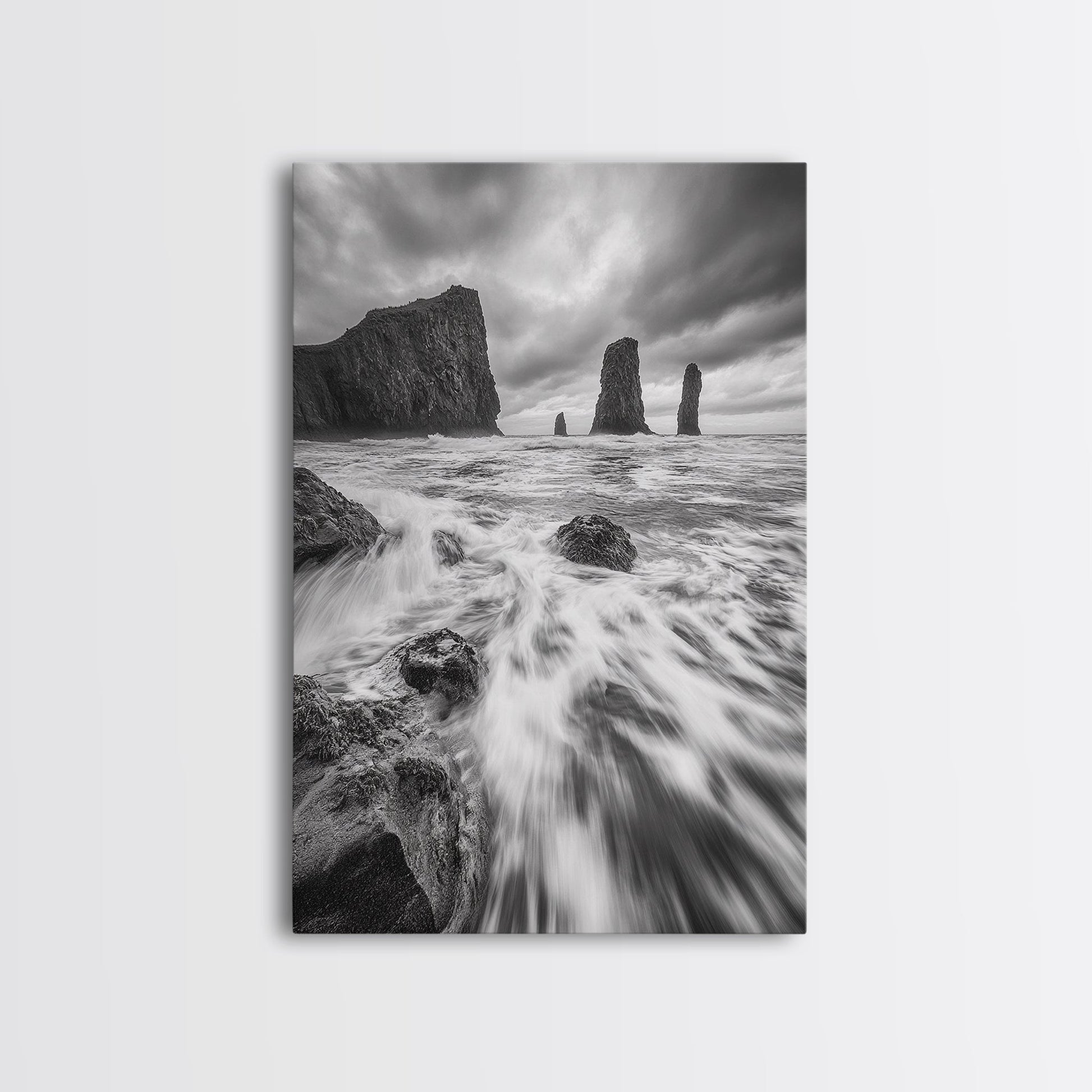 Sea Stacks Seascape, Ocean Art, Moody Coastline Print, Nature Photography, Framed Canvas Print, Living Room Wall Art, Black White Seaside