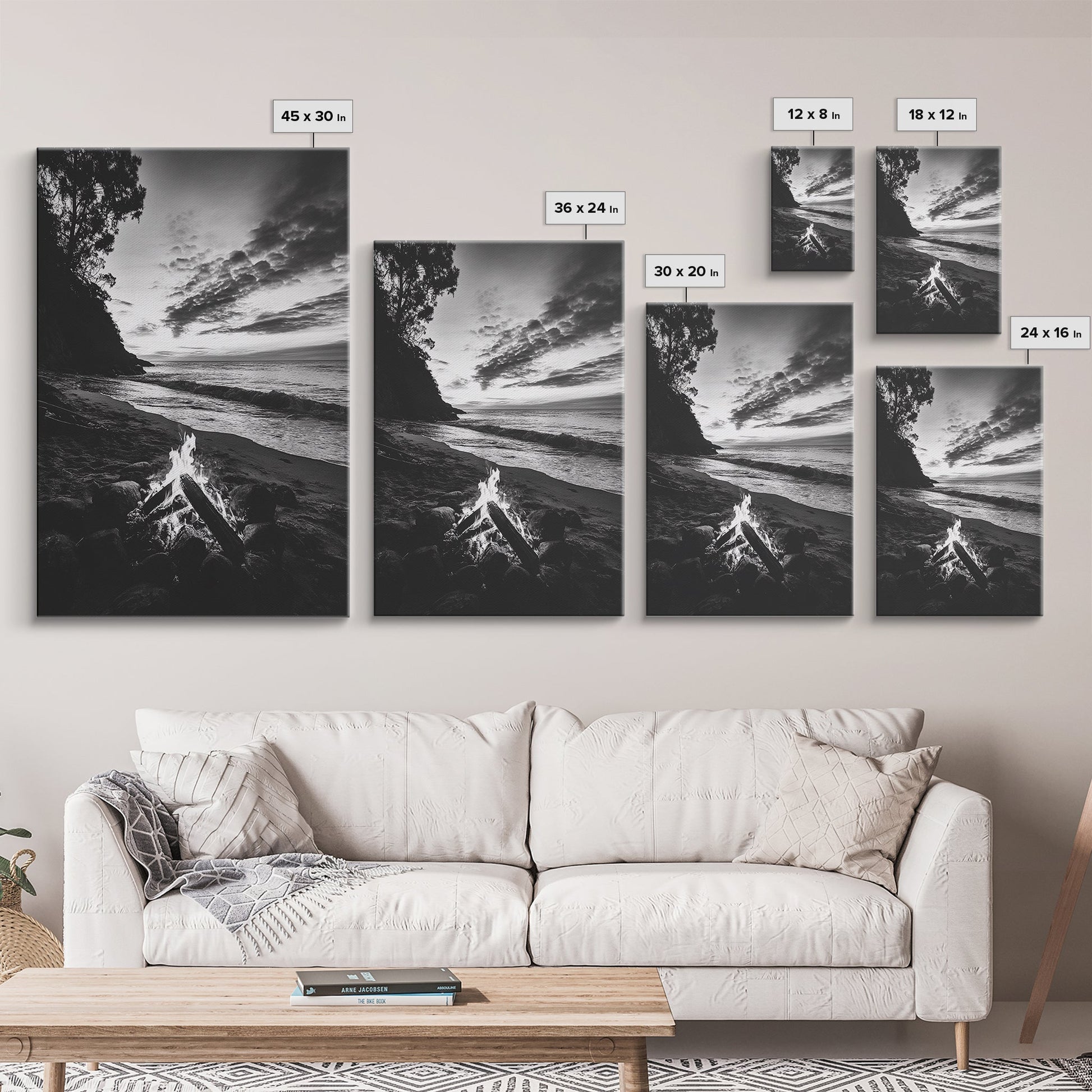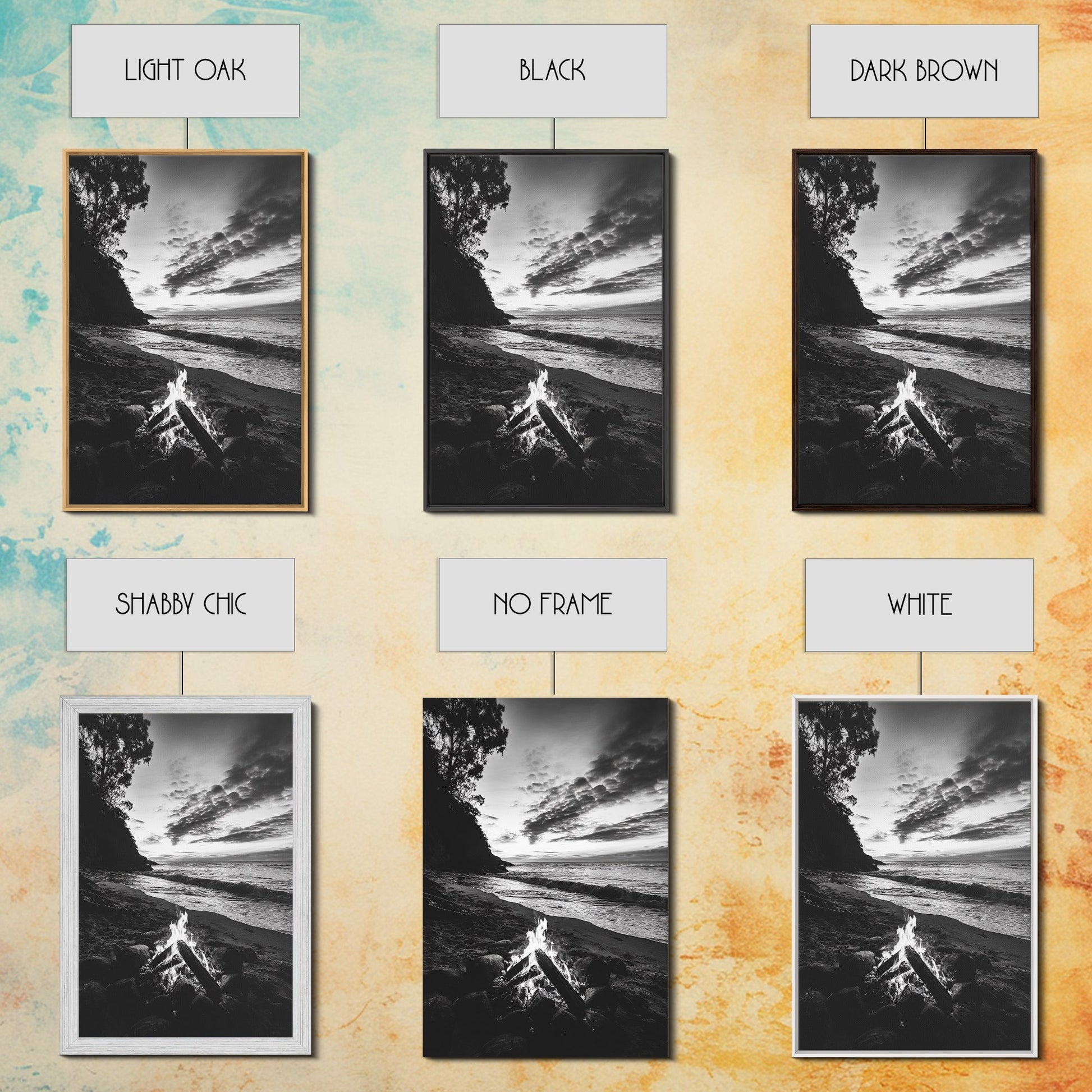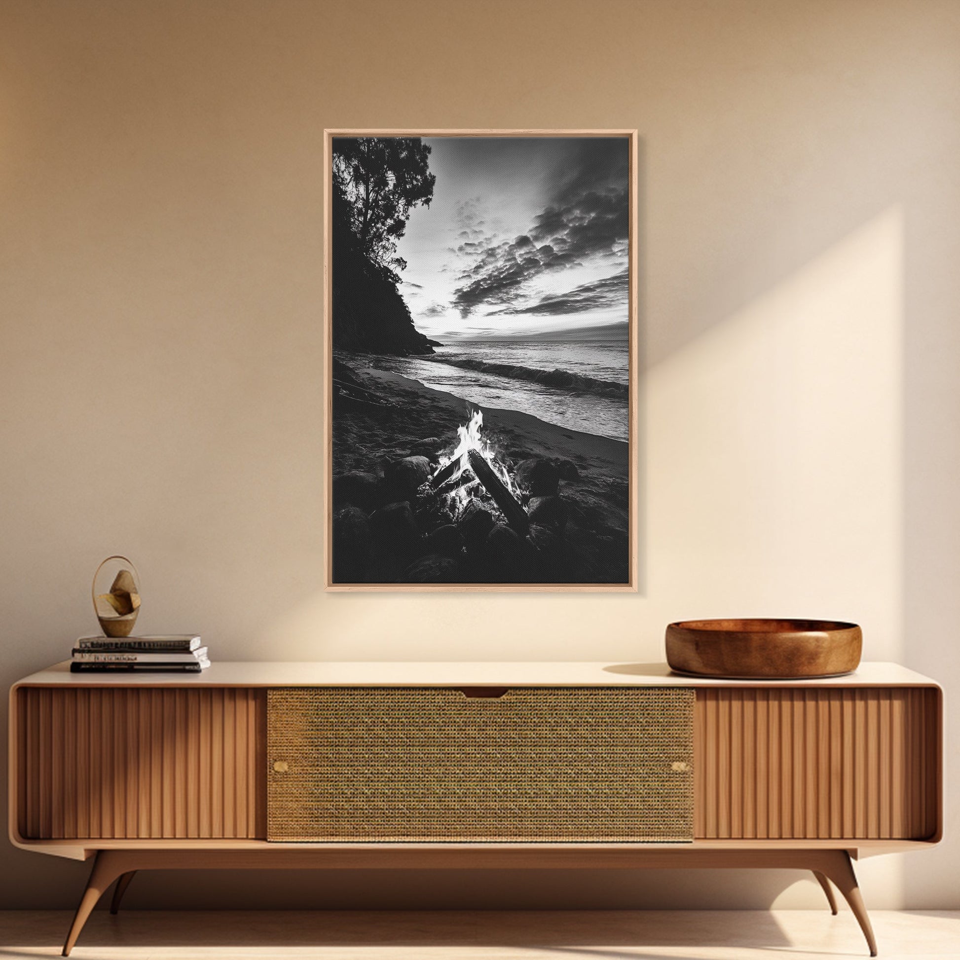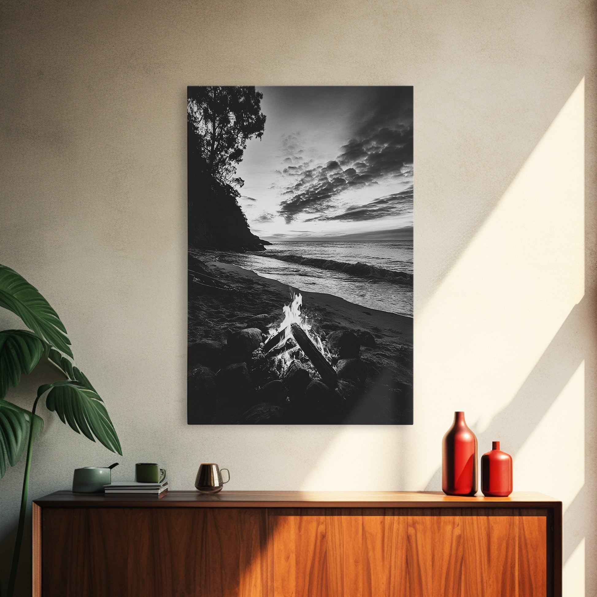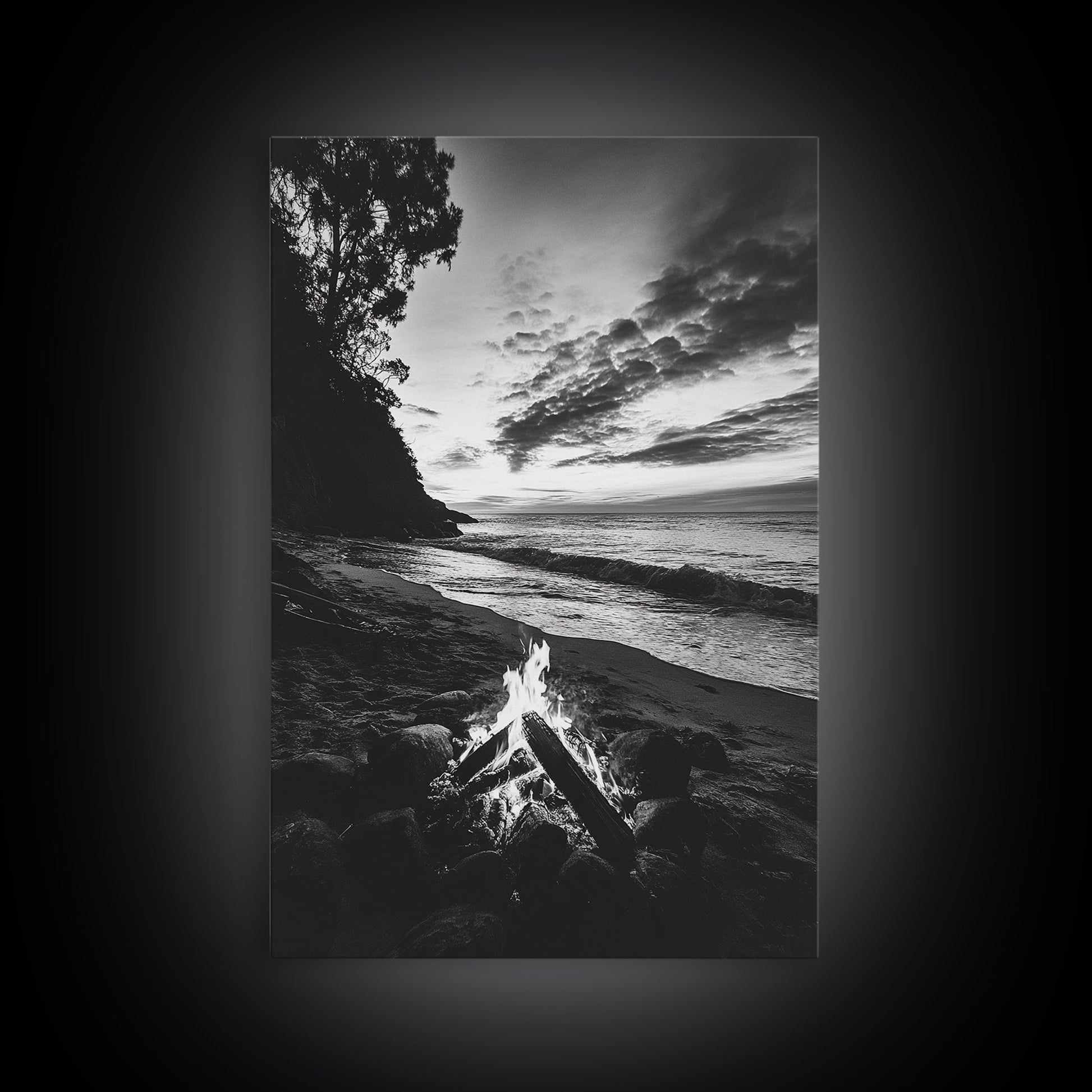 Shoreline fire night, beach flames, evening waves, rustic warmth, Canvas Print, Autumn decor, outdoor adventure minimalist wall art