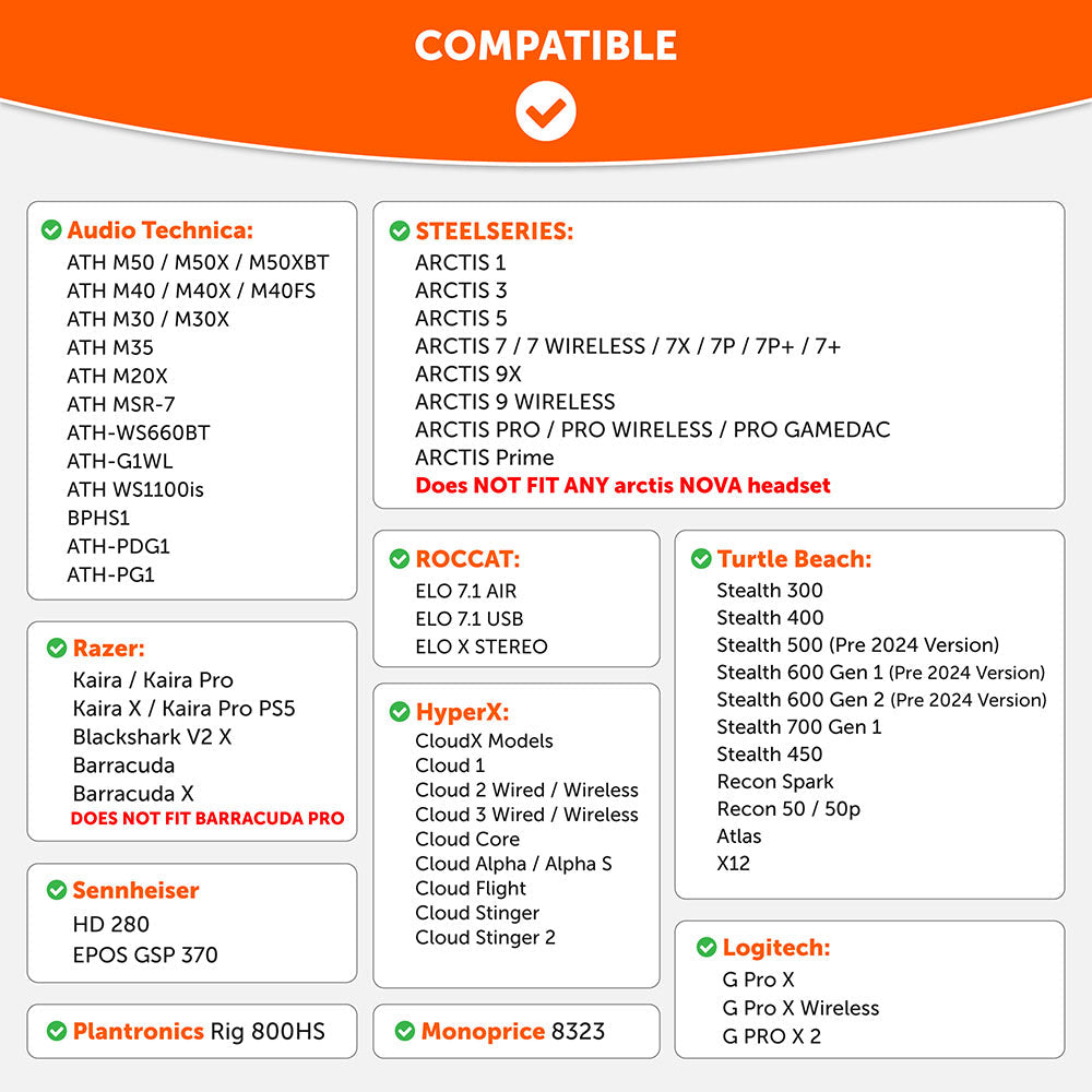 COMPATIBLE WITH: HyperX, SteelSeries Arctis, Turtle Beach, Razer (Full Chart In The Second Image)